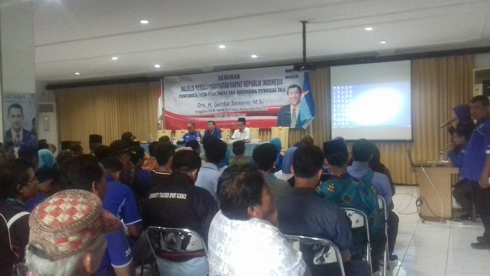 “Jombang siap memenangkan Demokrat. Apalagi pak Guntunr nanti mencalonkan lagi. Siap mencoblos,” kata Ketua DPC Partai Demokrat Jombang, H. Syarif Hidayatullah pada acara bertema Seminar MPR RI, ‘Pancasila, UUD 1945, NKRI dan Bhineka Tunggal Ika’ bersama Guntur Sasono dari Partai Demokrat di Home Stay Jombang, Kamis (14/9/2017) sore.