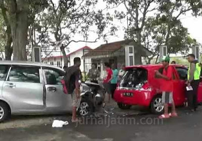 Dua mobil saling beradu di Jalan Raya Sumber Gempol, Kabupaten Tulungagung, Jawa Timur. Dua kendaraan itu yakni Brio Nopol AG 1625 YI, yang dikemudikan Yatatul Marifah, warga Kecamatan Gandusari, Trenggalek dan Toyota Avanza Nopol W 390 XW yang dikemudikan Imam Sugianto, warga Sidoarjo.