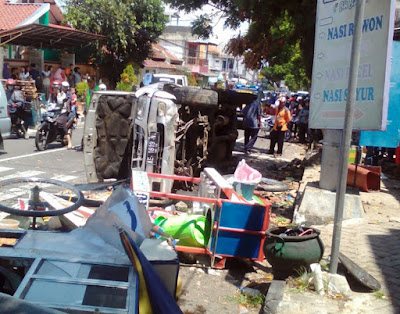Sebuah Mknibus jenis panther yang dikemudikan oleh Sigit warga Desa Mojopurno, Kecamatan Ngariboyo, Kabupaten Magetan, Jawa Timur terbalik setelah menabrak satu sepeda motor dan dua rombong milik pedagang kaki lima. Dugaan penyebabnya karena sopir mengantuk ketika mengemudi kendaraanya.