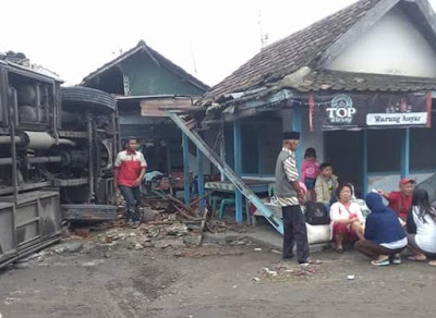 Sopir bus pun panik, dan langsung banting setir ke arah kiri. Karena hilang kendali, kendaraan berpenumpang sebanyak 40 orang itu menghantam warung dan teras rumah  milik Heni Nurfianti (37) warga setempat.