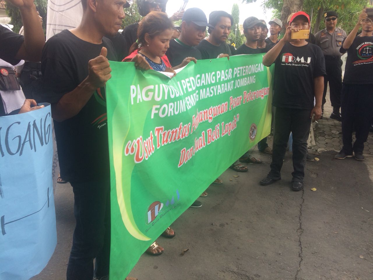 Puluhan pedagang pasar Peterongan, bersama Forum Rembuk Masyarakat Jombang menggelar aksi unjuk rasa di gedung DPRD setempat. Para pedangan menuntut pembagian lapak secara merata dan perbaikan jalan pasar yang rusak, Kamis (15/2/2018).