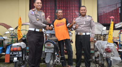 Kasatlantas Polres Ponorogo menyerahkan satu buah becak motor (Bentor) kepada Sardi, warga Sekayu, Kecamatan Sukorejo yang merupakan salah satu pengemudi becak motor yang dilaksanakan di halaman Polres Ponorogo.