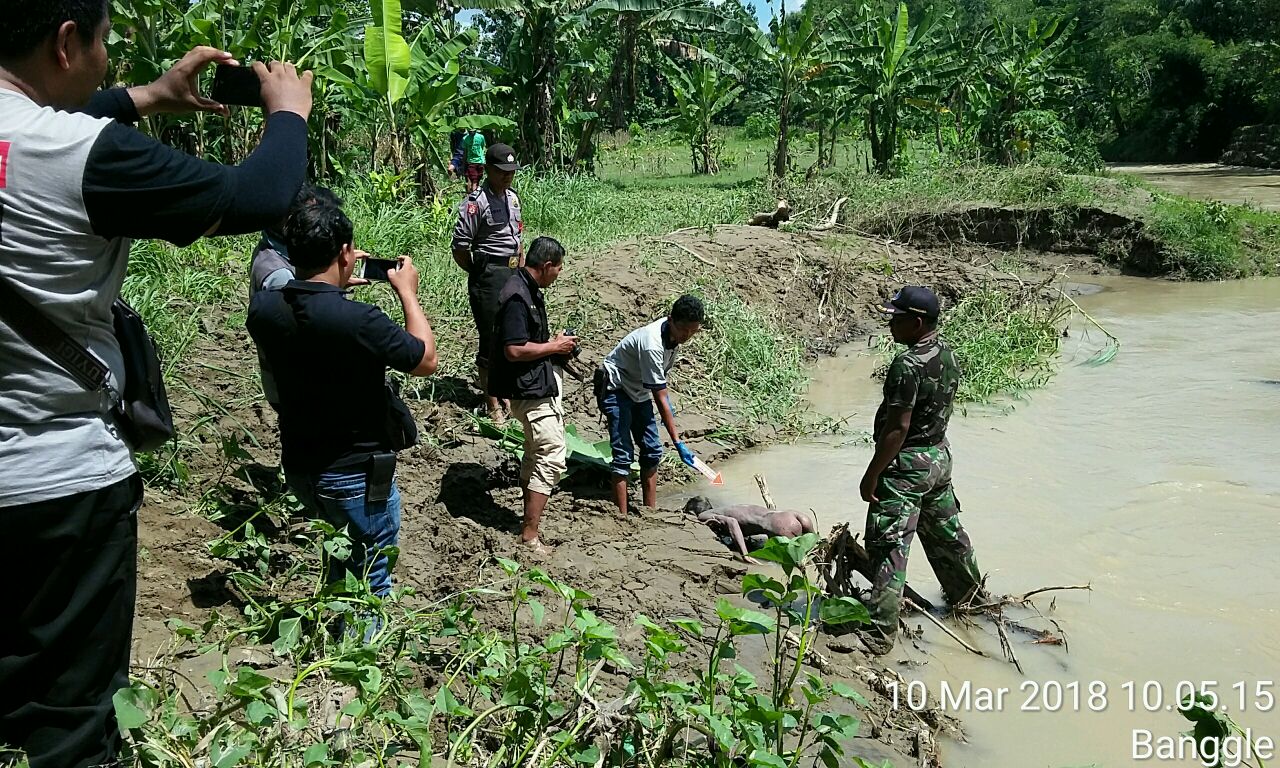 Mayat tanpa identititas ditemukan warga di tepu sungai Jurang dandang, Desa Bangle, Kecamatan Lengkong, Kabupaten Nganjuk, Jawa Timur, Sabtu (10/3/2018). Mayat itu berjenis kelami laki-laki dan tanpa busana.