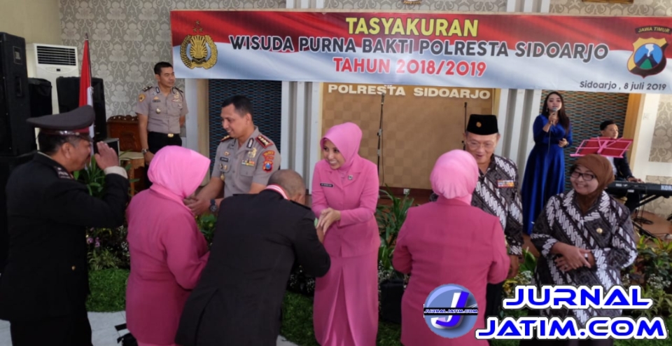 SIDOARJO (Jurnaljatim.com) – Polresta Sidoarjo menggelar acara tasyakuran wisuda purna bakti para anggota Polresta Sidoarjo. Para anggota, saling melepas dan meresapi satu sama lainnya. Praktis, suasana haru dan gembira menyelimuti acara tersebut.