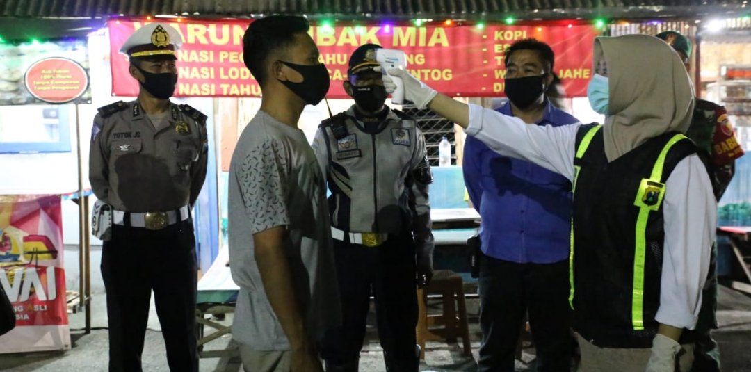 Seperti giat patroli gabungan yang dilakukan pada Sabtu malam (6/6/2020) di kawasan terminal peziarah makam KH Abdurrahman Wahid (Gus Dur), Desa Cukir, Kecamatan Diwek, Kabupaten Jombang. Puluhan sopir mobil pikap yang sedang berada di lokasi tersebut diperiksa suhu tubuhnya.